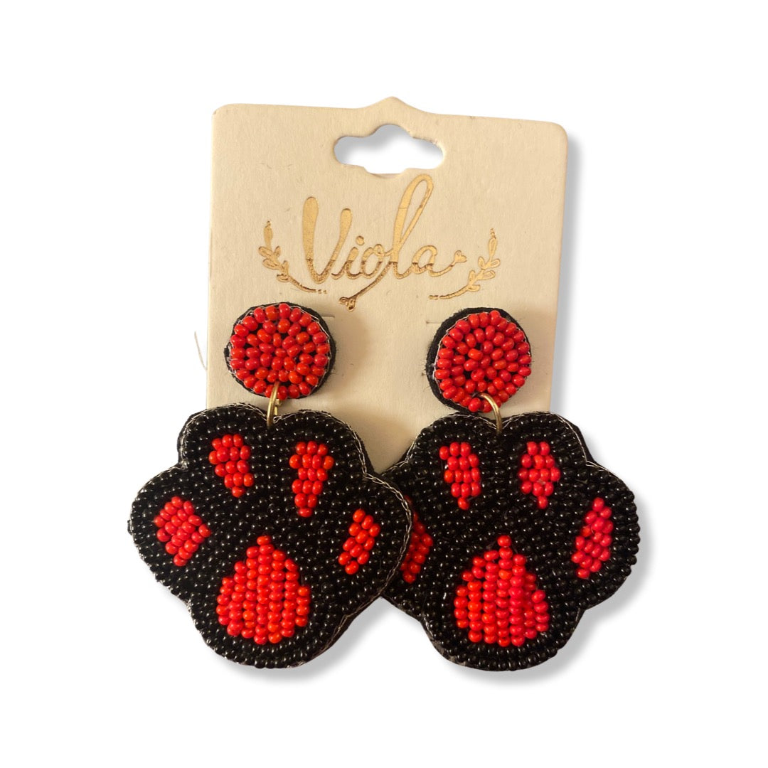 Red and Black Beaded Dog Paw Earrings