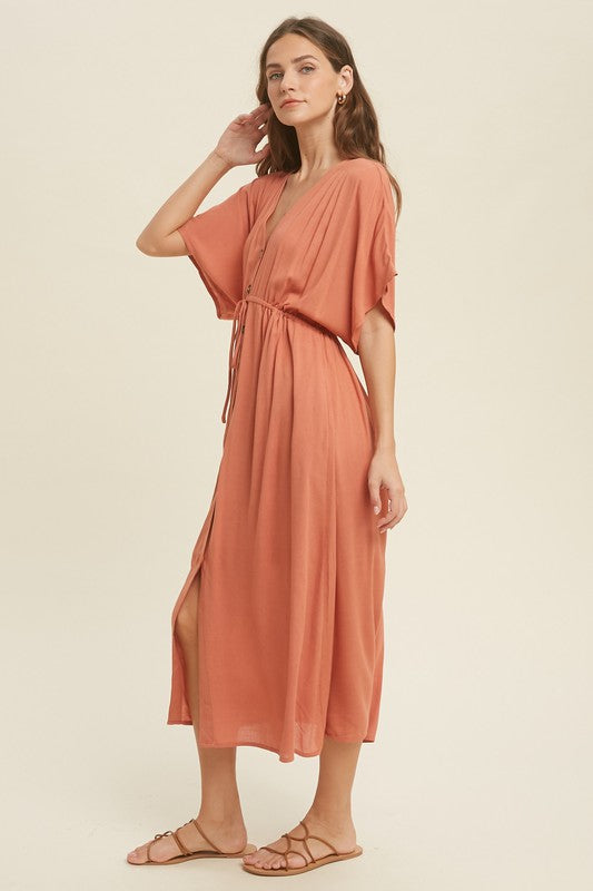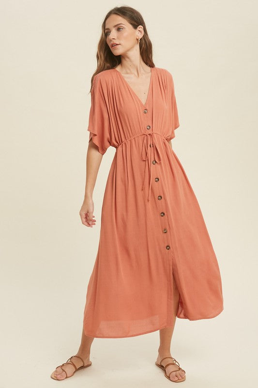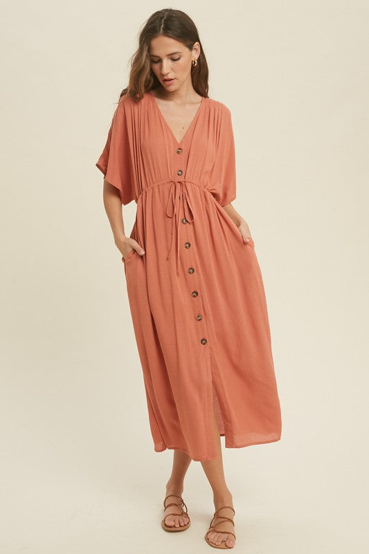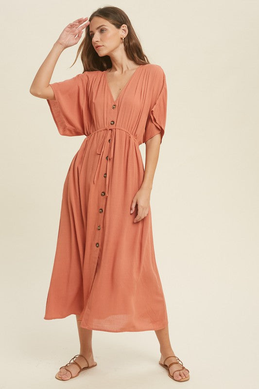 Button Up Midi Lace Dress with Drawstring
