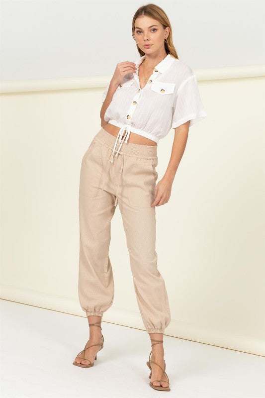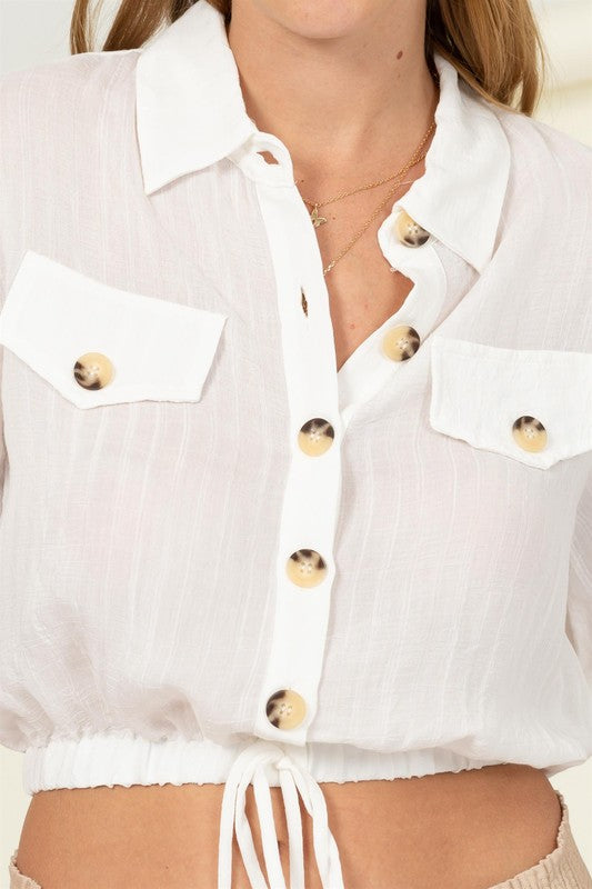 THE KNIGHTLY DREAMS BUTTON-UP CROP TOP IS READY FOR A STYLISH ADVENTURE! IT FEATURES A COLLARED NECKLINE, SHORT SLEEVES AND A BOXY, WIDE-CUT BODICE. IT HAS A FUNCTIONAL BUTTON PLACKET AND TWO FRONT FLAP POCKETS BEFORE ENDING AT A CROPPED DRAWSTRING HEM.